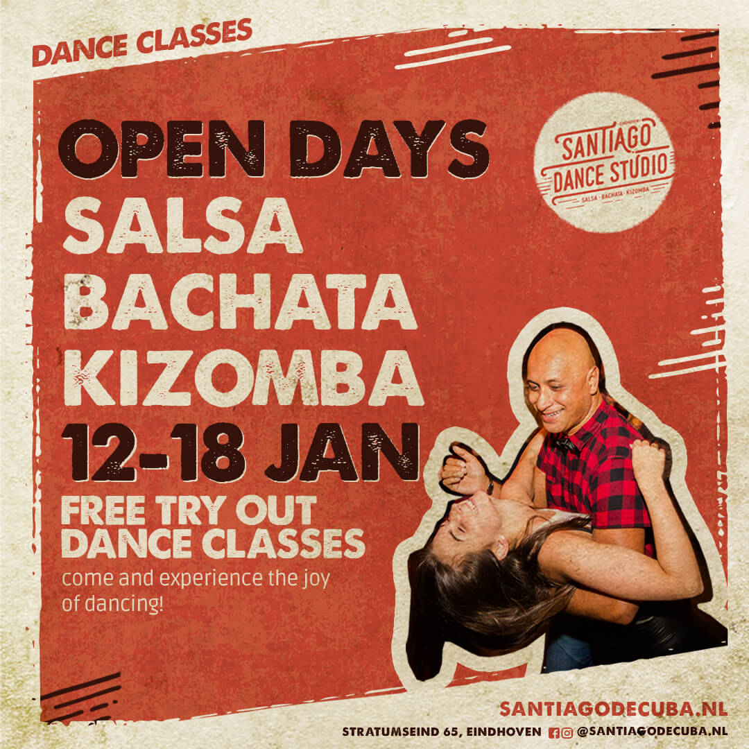 Tijdens de opendagen maak je kennis met de basisstappen van Salsa, Kizomba, Merengue, Bachata en andere Latijnse dansstijlen. Je hoeft geen danservaring te hebben en je hoeft niet verplicht met een danspartner te komen. Onze docenten van Santiago Dance Studio lopen rond om al je vragen te beantwoorden en je te helpen met de danspasjes, uiteraard! De proeflessen zijn gratis, vrijblijvend en toegankelijk voor jong en oud!